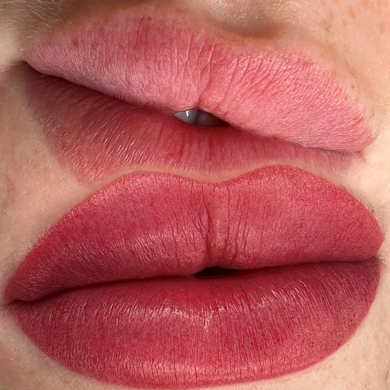 Derefter tilføres huden farve. Vi toner altid farven ind på læben for at få et mere naturligt resultat. Dette kan gøres delvist, hvor toningen laves til ca. midt på læben, for at opnå en mere tredimensionel effekt, eller det kan laves på hele læben, hvor man således opnår en mere ensartet farve på hele læben. Begge teknikker kan laves med og uden lipliner. Hvis du er i tvivl om hvilken metode der passer dig bedst, så er du altid velkommen til at kontakte os!